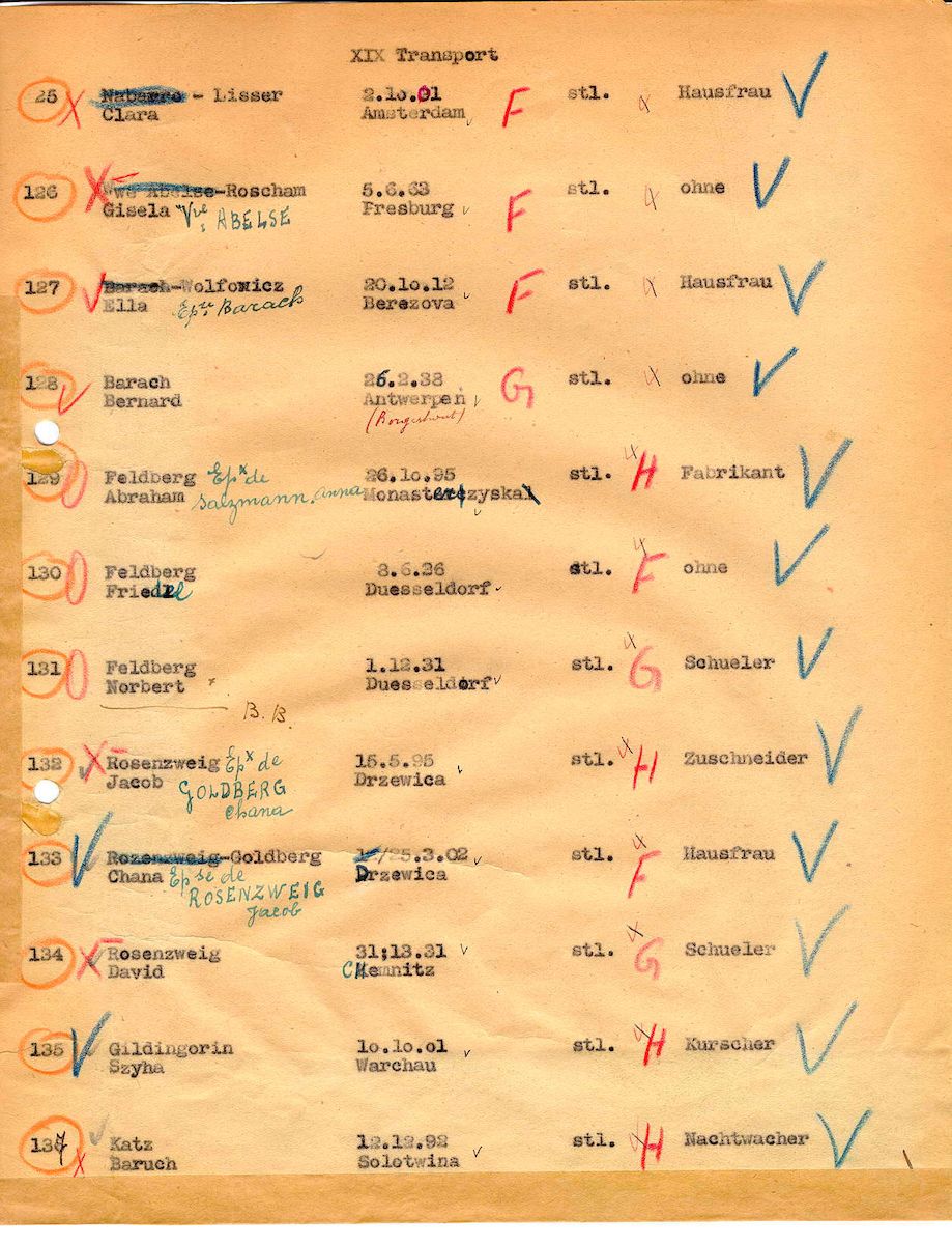 Zunächst nach Vorladungen bei den Behörden und ab August 1942 bei Razzien wurden Juden verhaftet und in das belgische „Judendurchgangslager“ Mechelen (Malines) überführt, unter ihnen auch die aus Düsseldorf nach Belgien geflüchtete Familie Feldberg aus Düsseldorf (siehe abgebildete Deportationsliste). Das Lager hatte die SS in der Dossin-Kaserne im Juli 1942 eingerichtet. Am 11. Juni 1942 hatte die Brüsseler Zentralstelle für jüdische Angelegenheiten aus Berlin den Auftrag erhalten, auch die Deportation der in Belgien befindlichen Juden vorzubereiten. Mechelen – geografisch günstig gelegen zwischen den großen Städten Brüssel und Antwerpen – diente als Sammel- und Durchgangslager für die im Land verhafteten Juden. Achtundzwanzig Deportationstransporte verließen zwischen dem 1. August 1942 und dem 31. Juli 1944 das Lager. Einer dieser Transporte hat eine besondere Geschichte: Der 20. Deportationstransport vom 19. April 1943 wurde auf dem Weg vom Bahnhof Mechelen nach Auschwitz von drei jungen belgischen Widerstandskämpfern auf freier Strecke gestoppt, ein Waggon geöffnet, um Deportierten zur Flucht zu verhelfen.
