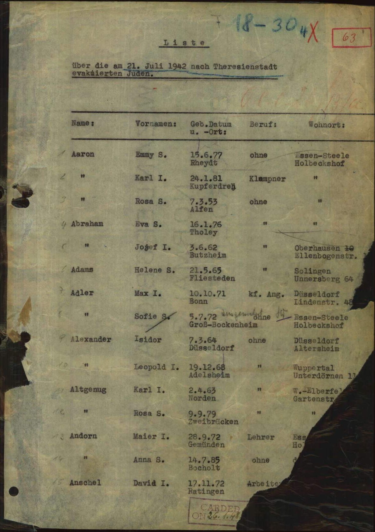 Am 21. Juli 1942 wurde der fast 71-jährige Max Adler von Düsseldorf aus in das Ghetto Theresienstadt deportiert. Zu dieser Zeit hatte er bereits zwölf Jahre in Düsseldorf gelebt.