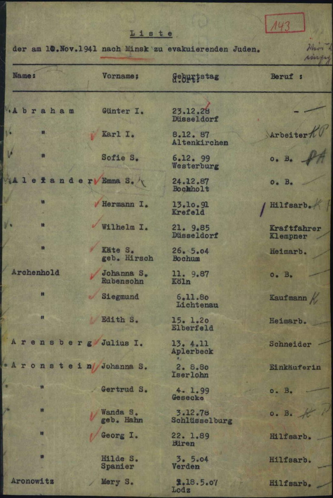 Das Ehepaar Alexander musste am 5. Juli 1941 in die Derendorfer Straße 47 umziehen. Das Haus wurde zu dieser Zeit fast ausschließlich von jüdischen Familien bewohnt. Am 10. November 1941 wurde Emma Alexander mit ihrem Ehemann von Düsseldorf ins Ghetto Minsk deportiert. Beide haben nicht überlebt.