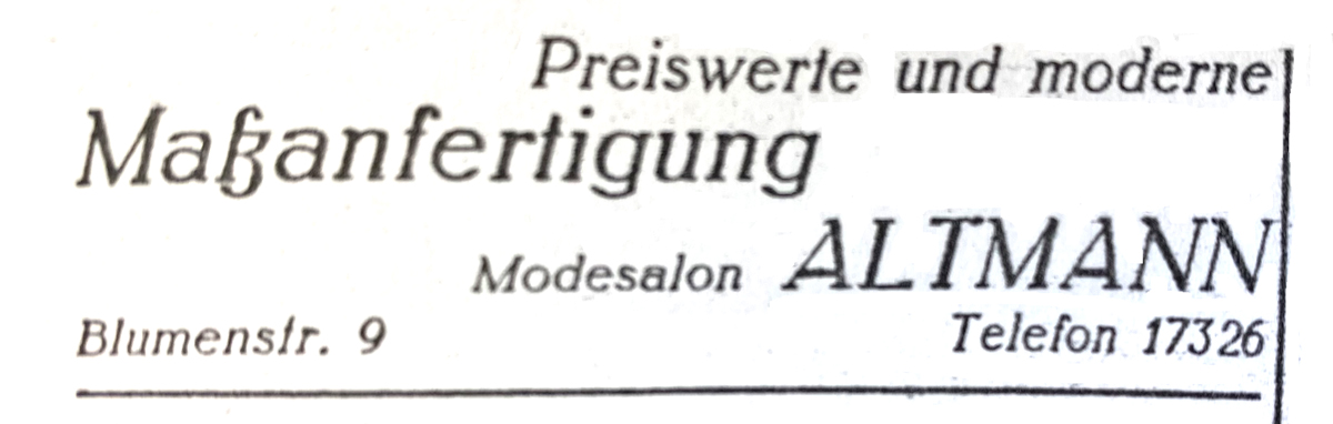 Auch ihr Mann David arbeitete als Schneider. Sein Bruder Samuel Altmann führte schon seit 1892 ein Konfektionshaus im westfälischen Münster. Dessen Düsseldorfer Filiale übernahm David Altmann. Johanna Altmann, ebenfalls gelernte Schneidermeisterin, betrieb einen Modesalon in der Blumenstraße 9, wo die Familie – am 28. Dezember 1921 wurde der einzige Sohn Alfred geboren – auch wohnte.