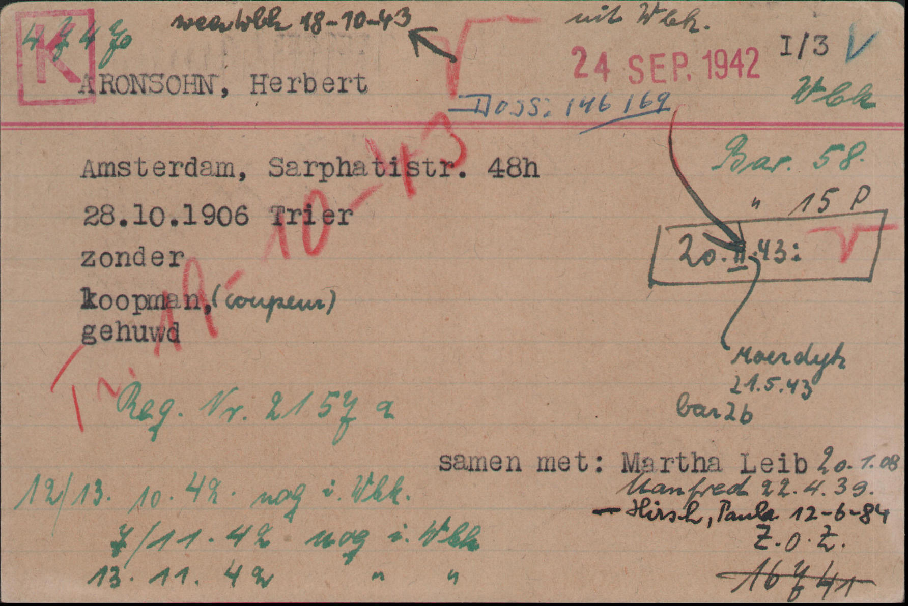 Ab dem 27. März 1938 unterhielt Herbert Aronsohn zusammen mit seinem Schwager Walter Leib die Firma “Leib & Co. Hungaria-Paprika” in der Prinsengracht 75 in Amsterdam. Später wohnten sie auch in diesem Haus. Am 22. April 1939 wurde in Amsterdam ihr Sohn Manfred Gustav Aronsohn geboren. Den Zweitnamen erhielt er in Erinnerung an Marthas Vater Gustav Leib, der am 3. Mai 1938 verstorben war. Am 23. Oktober 1940 erfolgte der Umzug in die Nieuwe Prinsengracht 93 III. Ab Februar 1942 war Herbert Aronsohn mit seiner Frau und dem kleinen Sohn in der Sarphatistraat 48 h gemeldet. Auf der Karteikarte aus der Kartothek des Judenrats in Amsterdam ist vermerkt, dass auch seine Mutter Paula Aronsohn, geborene Hirsch, bei ihnen gemeldet war. Sein Vater Max Aronsohn war am 30. Mai 1941 in Amsterdam im Alter von 72 Jahren verstorben.