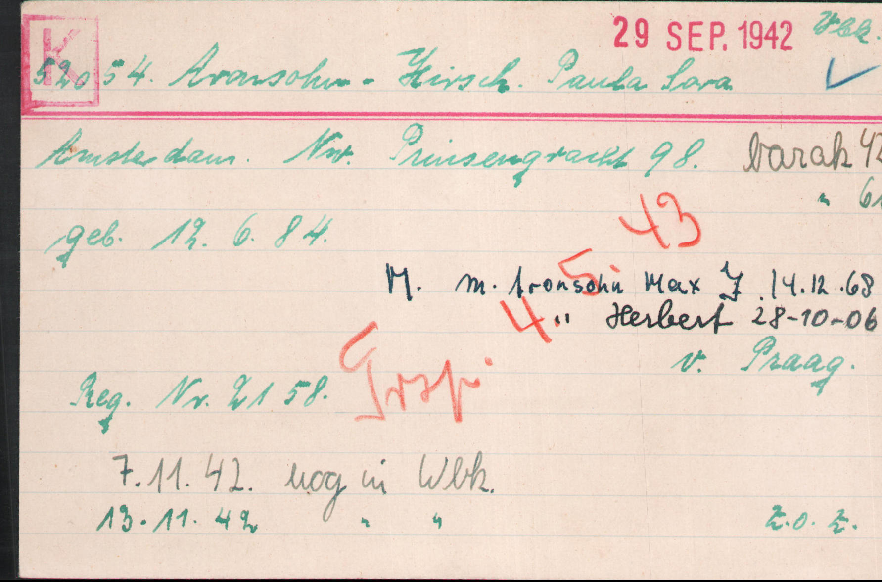 Die nächste belegte Adresse der Familie Aronsohn in den Niederlanden ist ab Februar 1942 Sarphatistraat 48. Auf der Karteikarte aus der Kartothek des Judenrats in Amsterdam ist vermerkt, dass dort auch Paula Aronsohn gemeldet war.