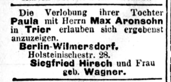Am 11. Januar 1906 heiratete Paula Hirsch in Berlin den Geschäftsführer Max Aronsohn aus Graudenz. Mit ihrem Mann zog sie nach Trier und wohnte dort in der Neustraße 4. Am 28. Oktober 1906 wurde ihr Sohn Herbert Aronsohn in Trier geboren. Kurze Zeit später zogen sie nach Düsseldorf, wo ihr einziges Kind die Schule und das Gymnasium besuchte.