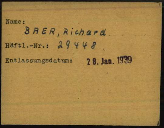 Richard Baer war vermutlich mit Grete Schmahl aus Gelsenkirchen verlobt, die in der Metzgerei als Verkäuferin beschäftigt war. Am 10. November 1938 waren ihre Eltern und ihr 18-jähriger Bruder Helmut zu Gast in Düsseldorf. Während des Novemberpogroms wurde Richard Baer zusammen mit allen anderen anwesenden Familienmitgliedern – auch denen der Familie Schmahl – verhaftet und im Polizeigefängnis Düsseldorf inhaftiert. Familie Schmahl wurde einen Tag später wieder entlassen, während Richard Baer bis zum 16. November 1938 festgehalten wurde, an dem er mit 79 weiteren Männern um 9:30 Uhr morgens von Düsseldorf „auf Transport“ ins Konzentrationslager Dachau geschickt wurde. Sie erreichten den Ort Dachau am Abend. Richard Baer musste zusammen mit den anderen Neuankömmlingen in der Novemberkälte, stundenlang auf dem Appellplatz stehend, auf ihre „Aufnahme“ warten; diese wurde erst für den 17. November 1938 eingetragen. Seine Häftlingsnummer lautete 29448. Am 28. Januar 1939 wurde Richard Baer aus dem KZ Dachau entlassen und konnte nach Düsseldorf zurückkehren.