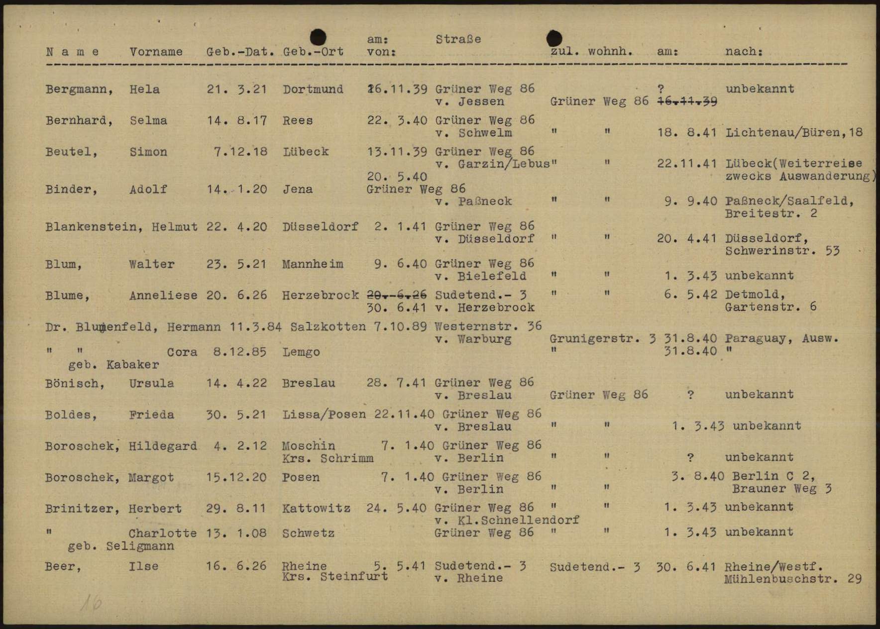 Die Adresse in Paderborn (Grüner Weg 86) weist auf das 1939 dort errichtete jüdische Umschulungslager hin, das im Laufe des Jahres 1941 zu einem Zwangsarbeitslager geworden war. Helmut Blankenstein war dort seit dem 1. Februar 1941 bis zum 20. April 1941. An diesem Tag wurde er nach Düsseldorf, Schwerinstraße 53, abgemeldet. Im Ghetto gab Helmut Blankenstein sein Arbeitsbuch mit der Nummer 169/81231 ab. Als Beruf gab er auf seiner Anmeldungskarte im Ghetto „Gärtner“ an.