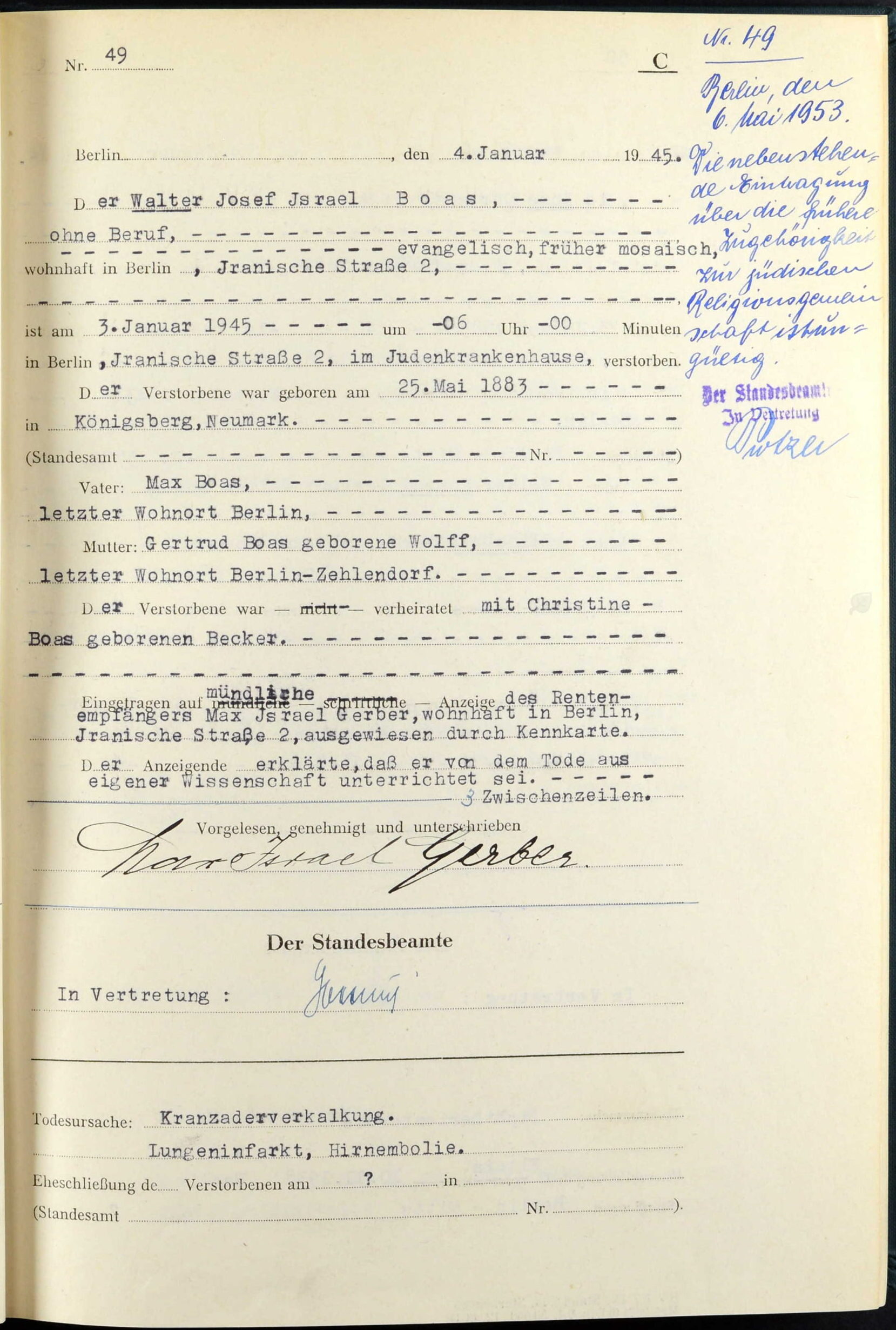 Walter Boas wurde am 17. September 1944 in einem „Sondertransport für Mischehepartner“ vom Güterbahnhof Düsseldorf-Derendorf deportiert. Der Transport erfolgte zunächst in das Arbeitslager Lenne-Vorwohle/Holzminden und von dort am 23. Dezember 1944 nach Berlin, Jüdisches Krankenhaus an der Iranischen Straße. Von dort wurden die Deportierten in das Ghetto Theresienstadt weitertransportiert. Walter Boas war nicht unter ihnen, er war am 3. Januar 1945 im Jüdischen Krankenhaus verstorben und wurde am 5. Januar 1945 auf dem Jüdischen Friedhof Berlin-Weißensee beigesetzt.
