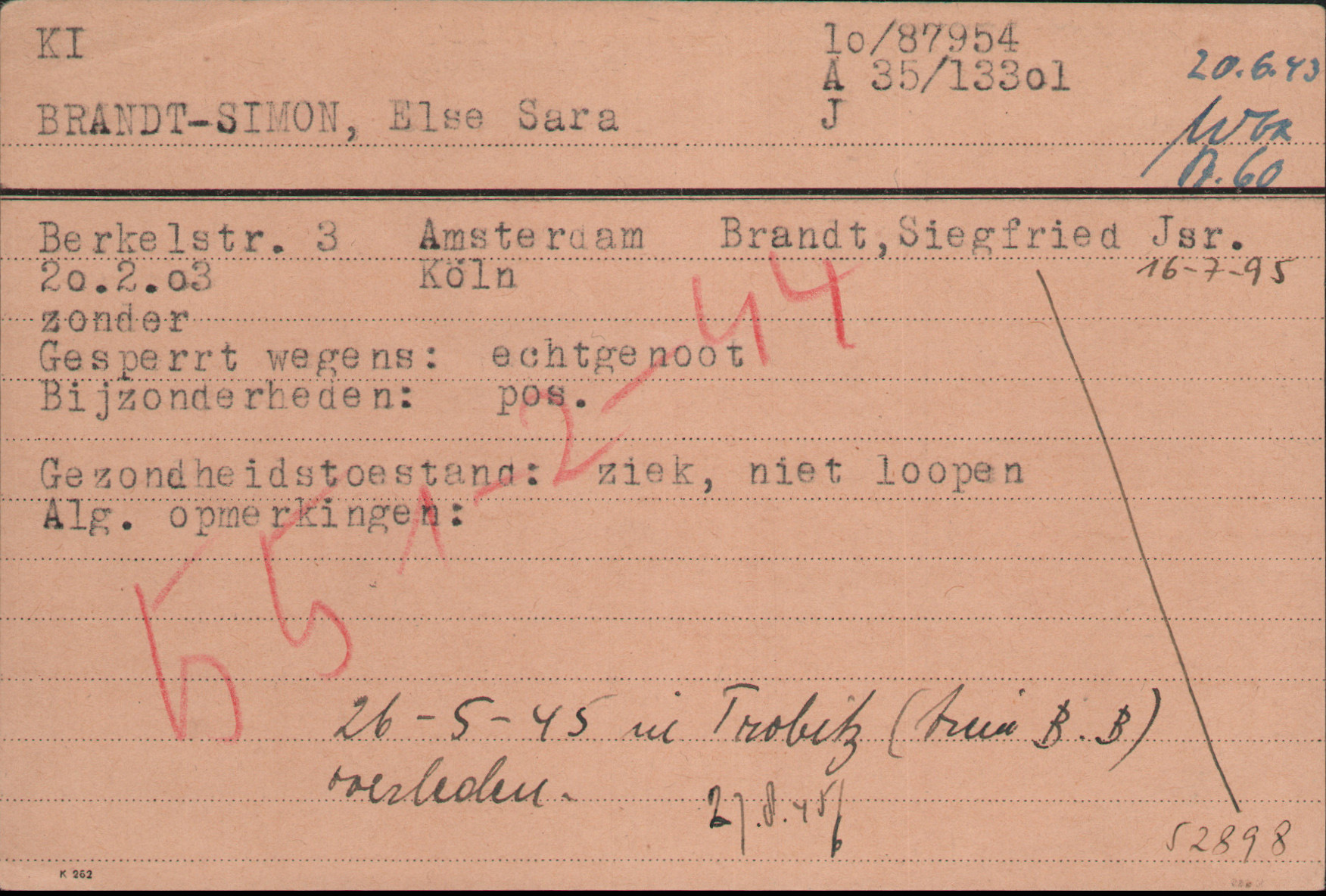 Am 20. Juni 1943 führten die Nationalsozialisten in Amsterdam eine großangelegte Razzia durch. Die Verhafteten, darunter auch Else Brand mit ihrer Familie, wurden noch am gleichen Tag in das polizeiliche „Judendurchgangslager Westerbork“ gebracht. Von dort wurden sie am 1. Februar 1944 in das Konzentrationslager Bergen-Belsen deportiert. Am 16. Februar 1945 verstarb ihr Ehemann Siegfried Brandt im KZ Bergen Belsen. Ihre Tochter Inge verstarb am 5. März 1945.