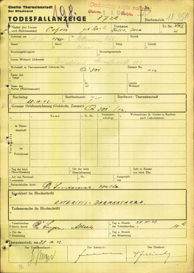Am 21. Juli 1942 wurde die 73-jährige Julie Cohen gemeinsam mit ihrem Mann Abraham von Düsseldorf aus in das Ghetto Theresienstadt deportiert. Mit demselben Transport kam auch ihr Schwager Max Cohen nach Theresienstadt, der zuvor im jüdischen Altenheim auf der Grafenberger Allee 78 gewohnt hatte.