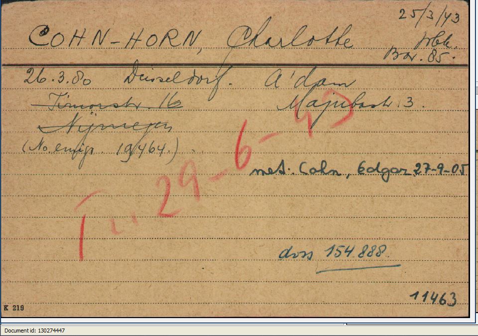 Am 29. Juni 1943 wurde Charlotte Cohn aus dem Durchgangslager Westerbork in das Vernichtungslager Sobibor deportiert und nach ihrer Ankunft am 2. Juli 1943 ermordet. Auch ihr Sohn Edgar Cohn und dessen Frau Anneliese überlebten nicht.