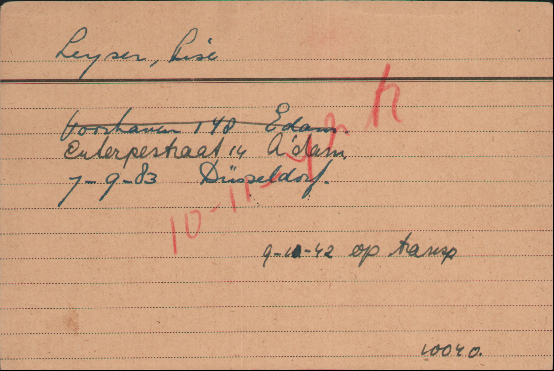 Im Jahr 1942 begannen die konkreten Vorbereitungen für die Deportation der jüdischen Bevölkerung. Im April 1942 mussten auch alle jüdischen Bewohner von Edam den Ort verlassen, davon betroffen war auch Lise Leyser. Sie musste sich – nur mit Handgepäck – nach Amsterdam begeben. In Amsterdam wurde Lise Leyser in einer Unterkunft in der Euterpestraat 14 einquartiert. Ihr Bruder Otto Leyser und dessen Frau Emma waren dagegen in Edam „zurückgeblieben“. Grund dafür war der Umstand, dass Otto Leyser „nicht transportfähig“ war, wie es in den Akten heißt.