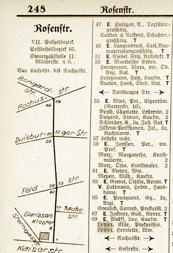 1925 ist im Düsseldorfer Adressbuch verzeichnet: Leyser, Elise, Prokuristin, Rosenstraße 69. Außer ihr wohnte im Haus nur noch ihre Schwester Martha mit ihrer Familie.