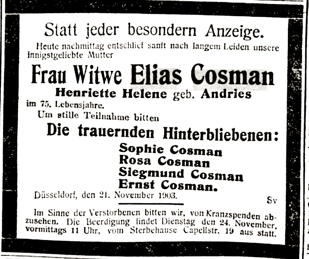 Am 21. November 1903 verstarb seine Mutter in Düsseldorf. Sie wurde 75 Jahre alt. Siegmund Cosman und seine Geschwister blieben alle unverheiratet. Sein Bruder Ernst Cosman unterhielt im Elternhaus eine Agentur. So vertrieb er beispielsweise Installationsbedarf im Heizungs- und Sanitärbereich. Siegmund Cosman arbeitete auch als Kaufmann, ob er in der gleichen Branche tätig war, wissen wir leider nicht. Im Hausbuch Kapellstraße 19 wurde später sein Beruf als „Bankbeamter“ eingetragen.