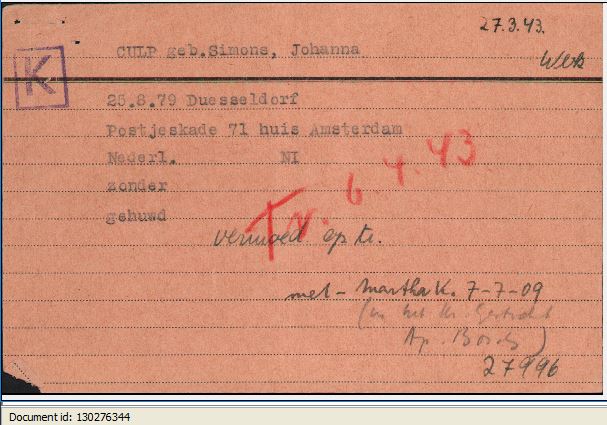 Ihr Ehemann Jacob Culp verstarb am 22. Dezember 1940 in Amsterdam. Ihr Sohn Richard Culp lebte weiterhin mit seiner Frau im Haus Postjeskade 71. Dort lebten auch Johanna Culp und ihre Tochter Martha.