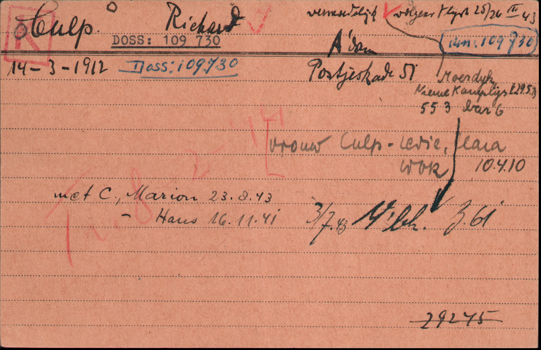 Sein Vater Jacob Culp verstarb am 22. Dezember 1940 in Amsterdam. Richard Culp lebte weiterhin mit seiner Frau im Haus Postjeskade 71. Dort lebten auch seine Mutter und seine Schwester Martha. Am 16. November 1941 kam in Amsterdam sein Sohn Hans Jacob zur Welt. Die stolzen Eltern inserierten eine Geburtsanzeige im „Het joodsche weekblad“.