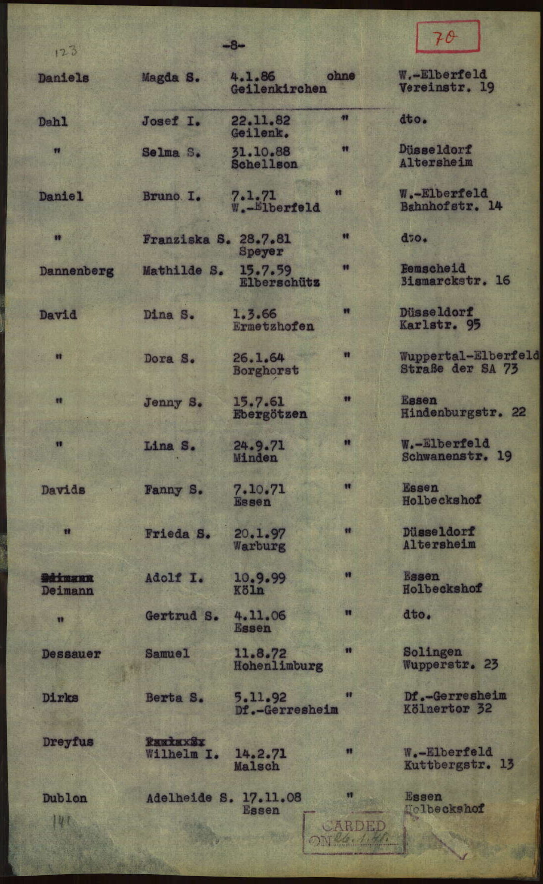 Ihre Schwester Jenny Moser lebte seit März 1938 in Düsseldorf. Nach dem Pogrom waren sie am 1. Dezember 1938 in die Konkordiastraße 66 gezogen. Ihr Sohn Fritz zog am 8. September 1938 nach Düsseldorf. Elfriede und ihr Mann folgten ihm kurze Zeit später. Für alle drei wurde als Adresse Konkordiastraße 66 angegeben. Am 13. April 1941 verstarb ihr Vater Simon Heidt im Altenheim der Jüdischen Gemeinde Düsseldorf im Haus Grafenberger Allee 78. Er erhielt einen Grabstein neben dem seiner Frau auf dem jüdischen Friedhof in Warburg.
