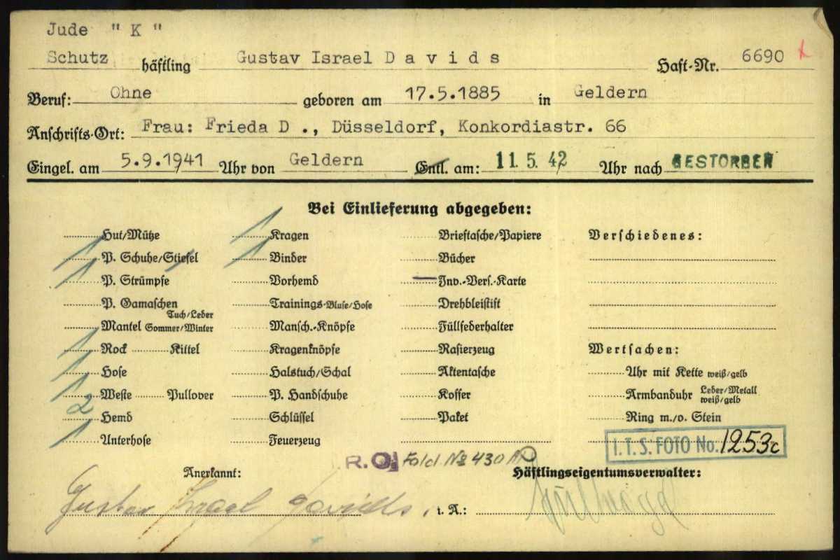 Am 5. September 1941 wurde ihr Sohn Fritz Davids ins Konzentrationslager Dachau eingeliefert. Auch ihr Mann Gustav wurde an diesem Tag verhaftet. Ihr Mann kam jedoch ins Konzentrationslager Buchenwald. Auf seiner Häftlingskarte wurde vermerkt, dass er in Geldern auf Weisung der Gestapo Geldern verhaftet wurde. Als Haftgrund wurde „Hamsterei“ vermerkt, sowie „politisch“ und „Jude“. Am 15. Oktober 1941 kam im KZ eine Mütze für Gustav Davids an. Vermutlich hatte sie ihm Elfriede Davids geschickt. Ob er sie tragen durfte muss bezweifelt werden. Sie wurde vermutlich nur seinen Effekten beigefügt. Ihr Mann befand sich zu diesem Zeitpunkt in Block 17 im KZ Buchenwald. Mehrfach ist im Lager auch der Eingang von Geld für Gustav Davids vermerkt. Vermutlich stammte auch dies aus Sendungen von Elfriede Davids.