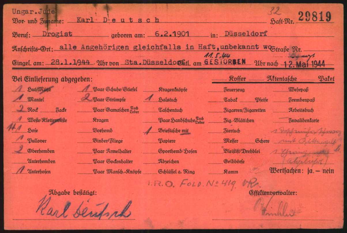 Am 9. Oktober 1943 wurde die gesamte Familie von der Gestapo verhaftet. Cecil Deutsch gab nach dem Krieg zu Protokoll: „Wir wurden am 10.10.1943 durch [den Gestapobeamten] Waldbillig verhaftet, und zwar mit der bewußt falschen Angabe, daß wir in unsere Heimat zurückbefördert würden. Als er unsere Wohnung, Zietenstraße 11, betrat, forderte er sofort von meinem Mann in der gemeinsten Form seine Brieftasche, welche mein Mann ihm auch aushändigte. Ich selbst lag krank zu Bett und wurde durch W. gezwungen, direkt aufzustehen und die Koffer mit den notwendigsten Sachen zu packen. Wir gingen dann zu Fuß, mein Mann, mein damals vierjähriges Kind und ich, zum Gestapogebäude in der Prinz-Georg-Straße. Da dort keine Gefängniszelle frei war, wurden wir mit dem Gefängniswagen zum jüdischen Gemeindebüro Bilkerstraße 25 transportiert. Im Gemeindehaus befanden sich auch meine Schwiegereltern, die infolge ihres hohen Alters im jüdischen Krankenhaus untergebracht waren. Auch ihnen wurde in äußerst schroffer Form gesagt, daß sie ihre Koffer zu packen hätten, was für den alten blinden Mann von 87 Jahren kaum faßbar war. Mein Mann wandte sich an Waldbillig mit der Bitte, seinen alten Vater in Düsseldorf zu lassen, welches Ansinnen in gemeinster Art zurückgewiesen wurde. […] Dann wurde dem damaligen Vorsitzenden der Gemeinde gesagt, ‘wir kommen in einer Stunde wieder und Ihr Kopf ist fällig, wenn einer der Familie Deutsch flüchten sollte’. So sah der Abtransport in unsere Heimat aus. Nach einer Stunde erschien W. um uns abzuholen. Draußen stand der Polizeiwagen, in dem sich schon einige Russen befanden. Wir wurden dazu geladen und dann sagte uns W., daß wir alle zusammen bleiben. In Anrath angekommen, wurde mein Mann und meine Schwiegervater von uns getrennt, und mein Kind, meine Schwiegermutter und ich wurden weiter in das Gefängnis in M.-Gladbach transportiert. Seit diesem Zeitpunkt habe ich weder meinen Mann, noch meinen Schwiegervater jemals wiedergesehen.“