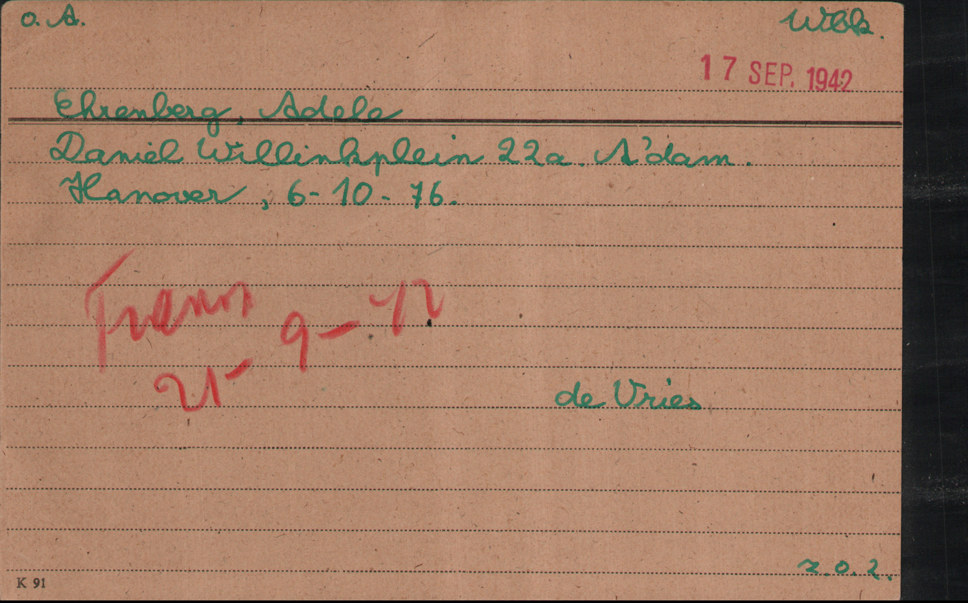 Am 18. August 1936 meldete sich Adele Ehrenberg von der Kronprinzenstraße 48 ab und unter der Adresse Daniel Willinkplein 21 a in Süd-Amsterdam an, die Hoffmanns folgten ihr zwei Jahre später. Am 3. Februar 1937 zog sie in die De Lairessestraat 160, vermutlich zur Untermiete bei einer Familie de Vries. Auch auf ihrer Amsterdamer Meldekarte ist vermerkt worden, dass sie von Juda Santcroos geschieden war. Vom 12. Januar 1942 war Adele Ehrenberg wieder unter der Adresse Daniel Willinkplein 21a in Süd-Amsterdam gemeldet. Am 10. April 1942 ließ sie ihren Paß verlängern. Ein diesbezügliches Dokument hat sich erhalten.