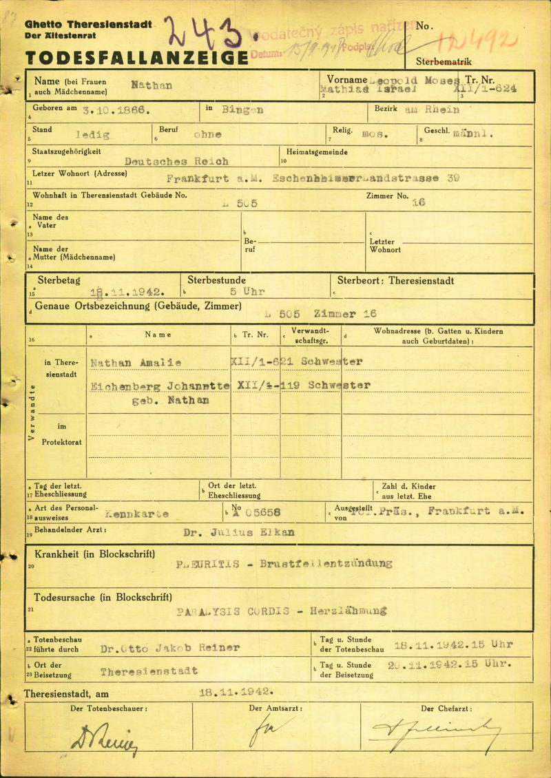 Vermutlich stand Johannette Eichenberg im Briefkontakt mit ihrer Tochter. Sowohl für diese als auch für Johanette Eichenberg selbst wurden die Lebensbedingungen immer schwieriger und die antijüdische Gesetzgebung immer gravierender. Im Oktober 1941 begann die ersten Transporte von jüdischen Bürgerinnen und Bürgern aus Frankfurt „in den Osten“. Die Nachrichten von dort haben vermutlich nicht nur Johannette Eichenberg und ihre Geschwister in Schrecken versetzt. Nun setzte die durch die Nationalsozialisten gezielt verbreitete Propaganda ein, dass das Ghetto Theresienstadt weniger schlimmer sei. Die Stadt sei eine gute „Heimstätte“ für ältere deutsche Jüdinnen und Juden.