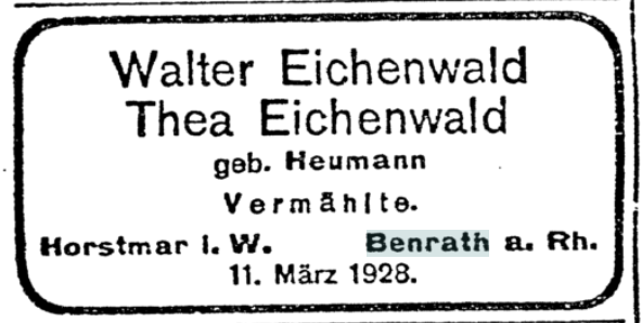 Walter Eichenwald kam am 30. Dezember 1900 in Horstmar (Münsterland) als Sohn des Handelsmanns Levy Eichenwald und dessen Frau Selma, geborene Cohen, zur Welt. Er hatte noch fünf Geschwister: Ernst, Jenny, Else, Otto und Bertha. Zusammen mit seinem älteren Bruder Ernst übernahm Walter Eichenwald 1925 das elterliche Textileinzelhandelsgeschäft „Levy Eichenwald“. Am 11. März 1928 heiratete er in Benrath Theresia Heumann. Sie war dort am 13. Juli 1900 als Tochter von Jonas und Selma Heumann zur Welt gekommen. Sie hatte noch zwei Schwestern: Martha und Helene Heumann (später verheiratete Blumenfeld). Zusammen mit ihnen unterstützte Thea Heumann ihre Mutter nach dem Tod von Jonas Heumann am 4. Februar 1923 bei der Führung des elterlichen Geschäftes an der Hauptstraße 46 in Benrath. Nach der Hochzeit stieg ihr Mann Walter Eichenwald in das Geschäft ein.