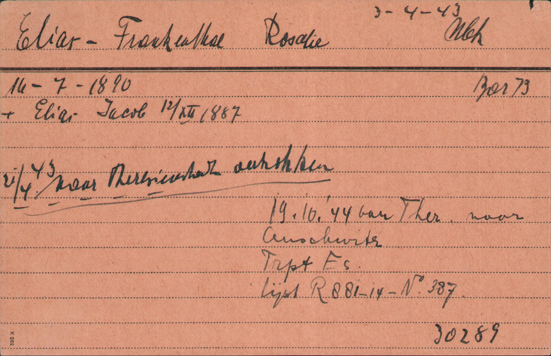 Drei Tage zuvor, am 3. April 1943, waren auch Rosalie und Jakob Elias verhaftet und ins Durchgangslager Westerbork verschleppt worden. Von dort wurden sie am 22. April 1943 ins Ghetto Theresienstadt deportiert. Am 19. November 1944 wurden die beiden in das Vernichtungslager Auschwitz deportiert und ermordet.