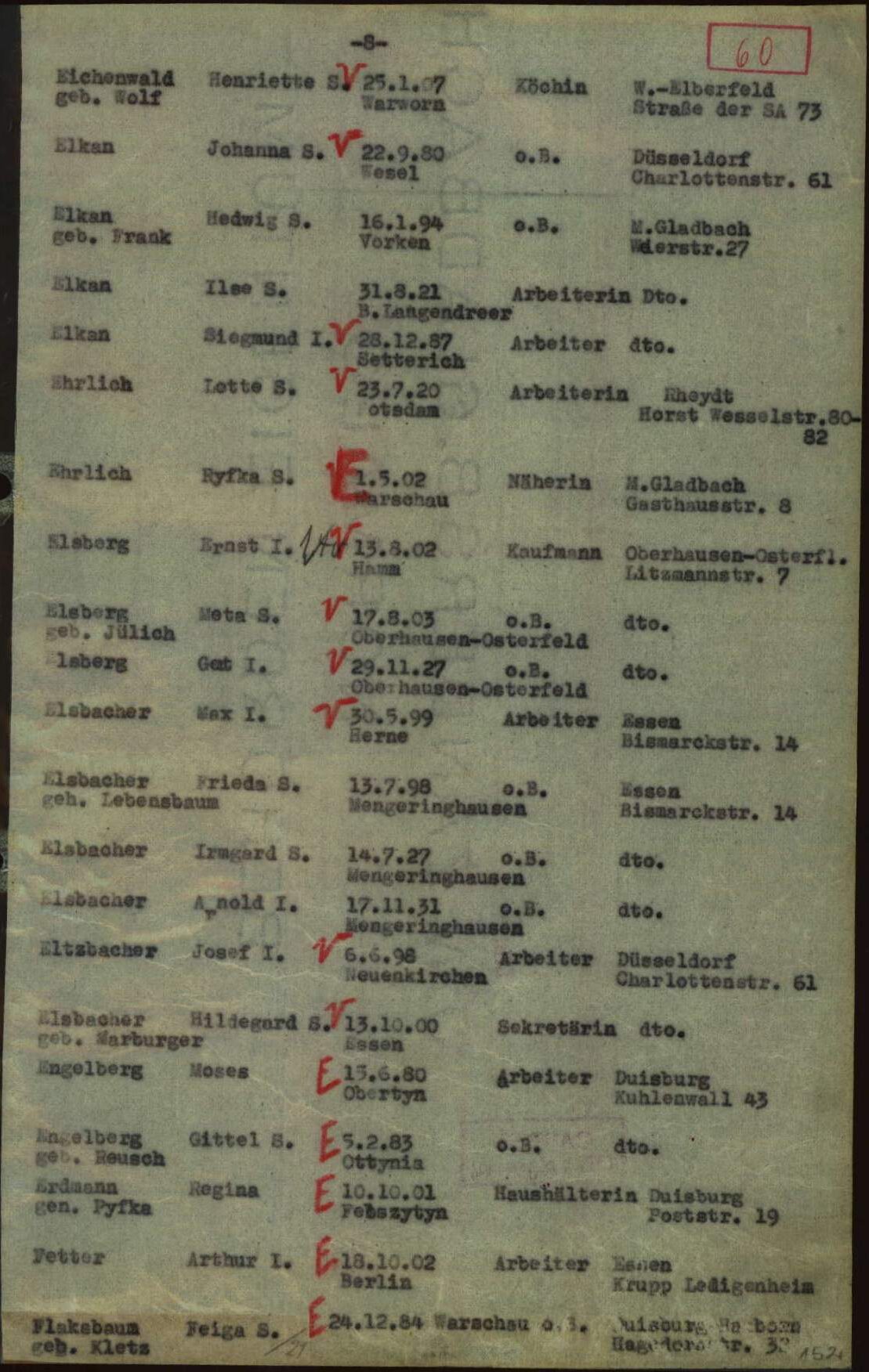 Hildegard Eltzbacher, ihr Mann Josef und ihre Schwiegermutter Meta zogen aus der Kaiser-Wilhelm Straße 15 zur Untermiete in die Charlottenstraße 61, wo ihr Einzug für den 21. Juli 1941 dokumentiert wurde. Hier wohnten sie bis zu ihrer Deportation. Hildegard und Josef Eltzbacher wurden am 22. April 1942 von Düsseldorf aus in das Dorf Izbica bei Lublin deportiert. Ihr weiterer Weg ist ungewiss. Sie haben nicht überlebt.