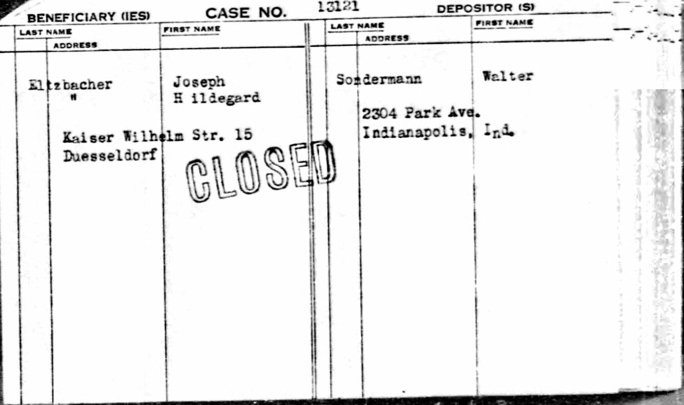 Hildegards Schwägerin Hedwig Sondermann, geborene Eltzbacher, emigrierte 1939 mit ihrem Mann in die USA. Hildegards Schwiegermutter Meta, die zuvor in Horn bei ihrer Tochter Hedwig gewohnt hatte, zog nun zu Hildegard Eltzbacher und ihrem Mann nach Düsseldorf in die Kaiser-Wilhelm Straße 15. Von hier unternahm ihre Schwiegermutter im März 1941 den Versuch zu Hedwig in die USA auszureisen, was jedoch misslang. Auch Hildegard und ihr Mann Josef Eltzbacher hatten leider erfolglos geplant in die Vereinigten Staaten zu emigrieren. Die dafür nötige Bürgschaft hatte Walter Sondermann übernommen.