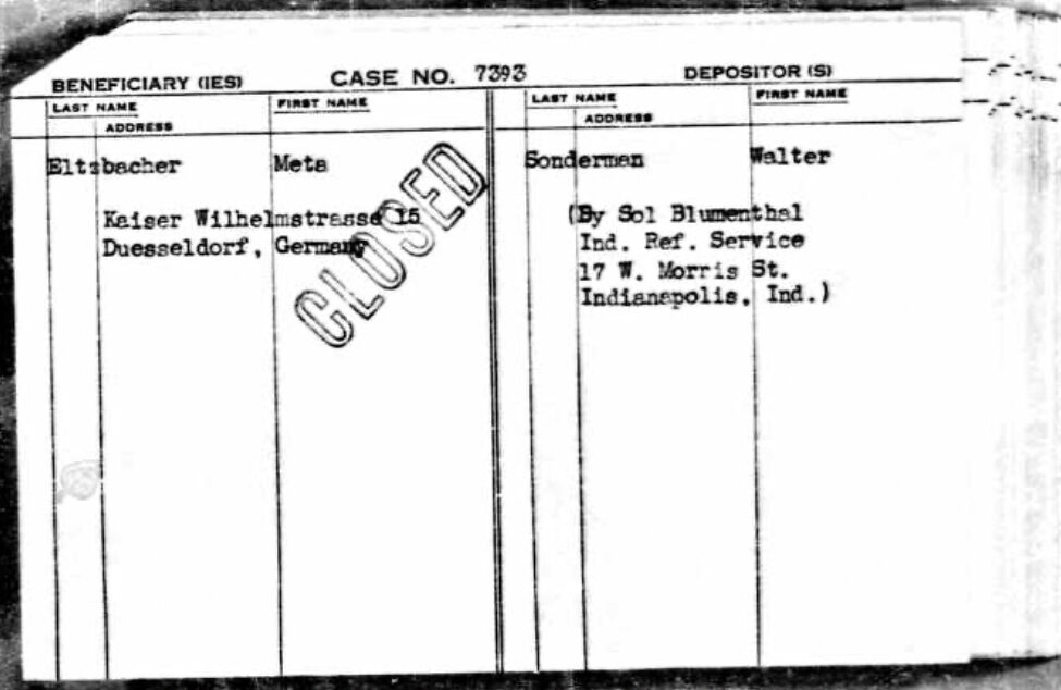 Währenddessen wohnte Metas Sohn Josef Eltzbacher mit seiner Frau Hildegard in Düsseldorf, wo er eine Wäscherei betrieb, die während des Pogroms im November 1938 überfallen und zerstört wurde.