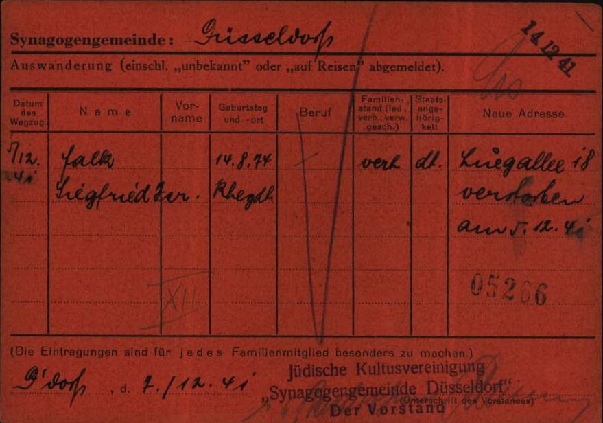 Seit dem 25. März 1938 wohnte das Ehepaar Falk dann in der Luegallee 18. Ihre Kinder wußte das Ehepaar Falk zu diesem Zeitpunkt bereits in Sicherheit. Ihre älteste Tochter wanderte 1939 mit ihrer Familie nach Palästina aus. Ihr Sohn Fritz Falk erhielt die Möglichkeit nach England auszureisen. So waren Siegfried Falk und seine Frau ab 1939 alleine in Düsseldorf. Nur noch über Briefe konnte der Kontakt zu ihren Kindern und Verwandten erfolgen. Am 1. Juni 1939 schrieb Siegfried Falk in einem langen Brief auch folgende Zeilen, ihre Auswanderungspläne betreffend: „wenn wir anstatt No. 44 000 für Amerika eine Nummer von 10 – 15 000 besitzen würden und es würde uns eine Bürgschaft für England gestellt, so würden wir alsbald dorthin ausreisen können, wo es von Deutschen und Düsseldorfer Menschen “ wimmelt“, während wir hier in Düsseldorf weder in der Innenstadt, noch im Grafenberger Wald, etc. überhaupt noch irgendeinem jüdischen Menschen begegnen; in Holland ist es ähnlich so ! Aber was ist da zu machen ?!“.