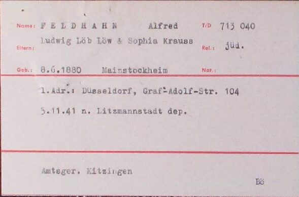Alfred Feldhahn wurde am 7. Mai 1942 aus dem Ghetto von Litzmannstadt/Łódź in das Vernichtungslager Chełmno gebracht und dort am nächsten Tag ermordet. Bei seiner Würzburger Bank, der Fürstlich Castell’schen Privatbank, befindet sich im Archiv ein Kuvert mit der Aufschrift „verzogen nach Lublin, weitere Adresse unbekannt. 24.6.42“. Dahinter verbirgt sich die Lebensspur seines Bruders Fritz Feldhahn, der wie Alfred Feldhahn noch Kunde der Bank war und ebenfalls deportiert und ermordet worden ist.