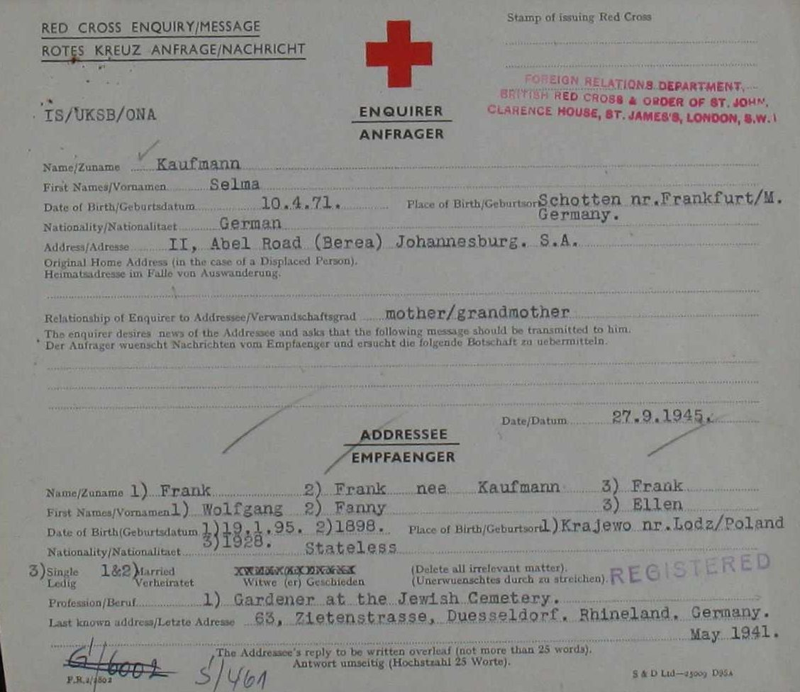 Die 14-jährige Ellen Frank wurde am 10. November 1941 zusammen mit ihren Eltern von Düsseldorf in das Ghetto von Minsk deportiert. Sie haben nicht überlebt. Nach dem Krieg stellte ihre Großmutter Selma Kaufmann aus Johannesburg vergeblich Nachforschungsaufträge an das Deutsche Rote Kreuz, um nach Spuren ihrer Tochter und Enkelin zu suchen.