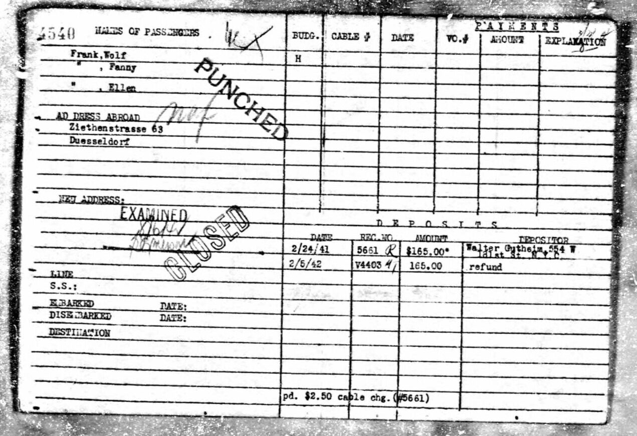 Ellens Tante Else Gutheim, geborene Kaufmann, emigrierte 1939 mit ihrer Familie nach Amerika. 1940 flüchteten auch ihre Großeltern Abraham und Selma Kaufmann nach Südafrika. Auch die Familie Frank wollten auswandern. Ihr Onkel Walter Gutheim übernahm Anfang 1941 eine finanzielle Bürgschaft für ihre Einreise in die USA. Doch die gesamten und umfangreichen Auswanderungsformalitäten konnten nicht rechtzeitig abgeschlossen werden.