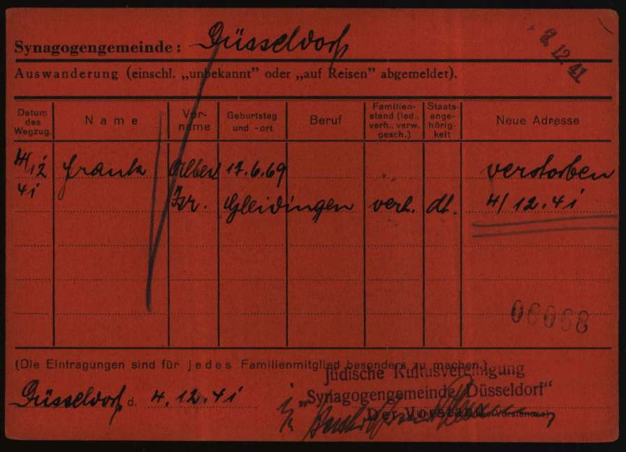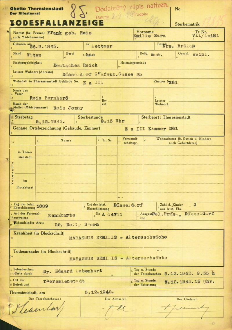 Am 21. Juli 1942 wurde die 77-jährige Emilie Frank vom Düsseldorfer Güterbahnhof Derendorf in das Ghetto Theresienstadt deportiert. Am 26. September 1942 verstarb sie im Ghetto Thersienstadt.