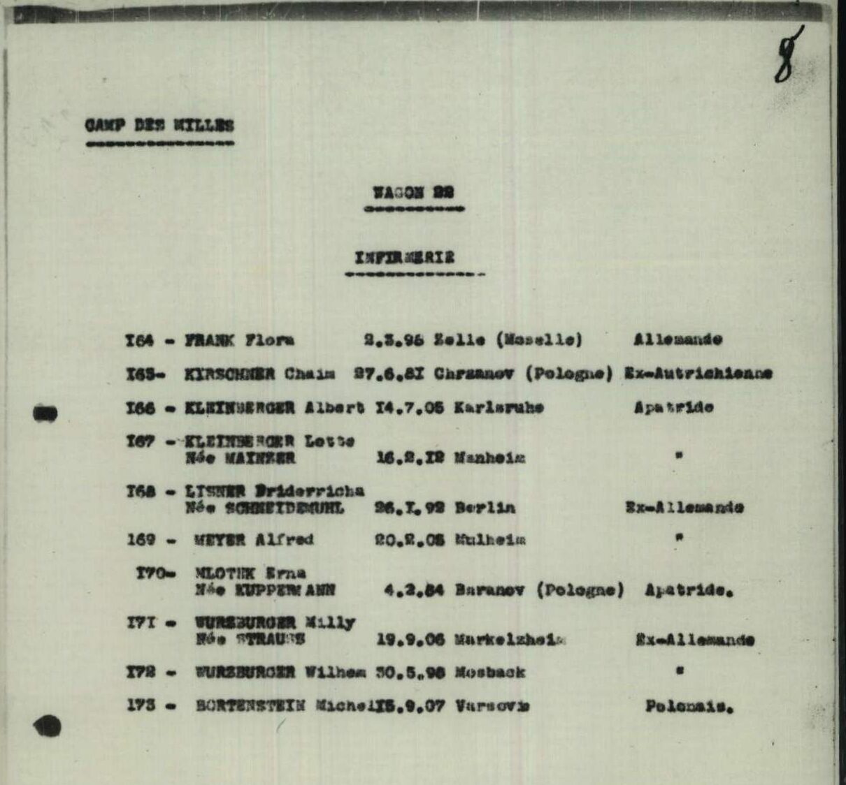 Flora Frank, die ihrem Mann aus Belgien nach Südfrankreich gefolgt war, wurde im Lager Les Miller interniert. Sie wurde aus dem Krankenhaus des Internierungslagers Les Milles im Waggon 22 nach Drancy gebracht. Dann wurde Flora Frank, getrennt von ihrem Mann, mit dem 21. Transport am 19. August 1942 nach Auschwitz deportiert und sofort nach der Ankunft ermordet.