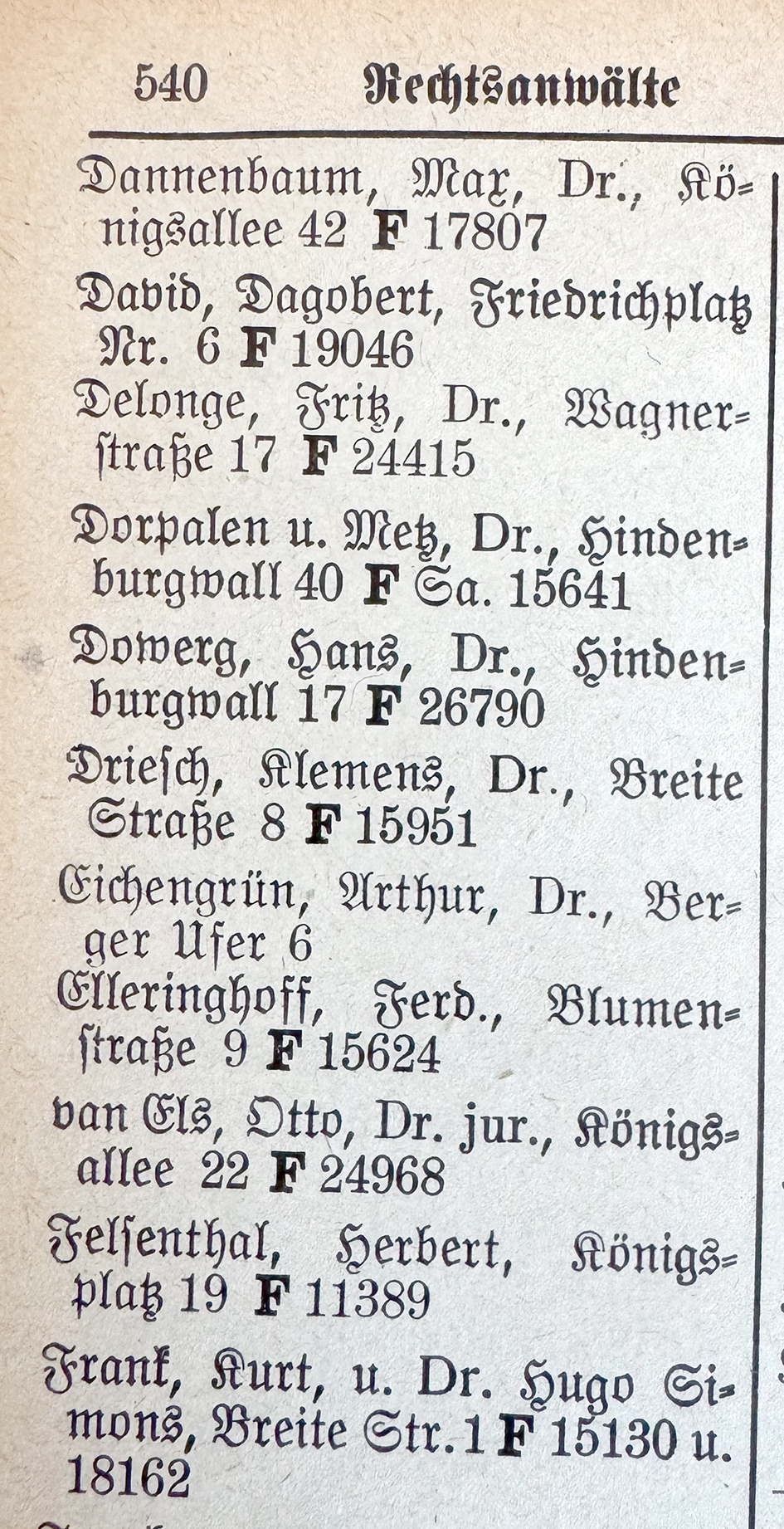 Seit 1922 arbeitete Dr. Kurt Frank als Rechtsanwalt am Landgericht Düsseldorf. Er betrieb er eine gut florierende Rechtsanwaltspraxis mit teilweise bis zu zwölf Angestellten. Zunächst hatte er ein Büro in der Marienstraße. Von 1925 bis 1928 verlegte er seine Kanzleiräume in die Breitestraße 25. Ab 1928 praktizierte er dann in der Breite Straße 1 zusammen mit Rechtsanwalt Dr. Hugo Simons. Ihre Anwaltssocietät hatte viele einflussreiche Klienten: die Bergischen Kraftfutterwerke, die Allianz und die Nordstern Versicherung, die Firma Klein am Wehrhahn und die Unternehmer Moritz Grünthal und Albert Schöndorff.