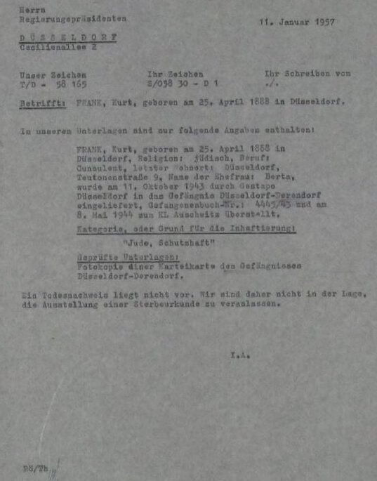 Dr. Kurt Frank wurde am 10. Oktober 1943 verhaftet und am nächsten Tag von der Gestapo in das Gerichtsgefängnis Düsseldorf-Derendorf eingeliefert. Als Vorwand für die Verhaftung diente der Vorwurf der Vermögensverschiebung. Seiner Ehefrau wurde erlaubt, am 23. Oktober 1943 „für den Schutzhaftgefangenen Frank, Kurt Israel, Wäsche umzutauschen und Schnürsenkel abzugeben.” Am 18.Januar 1944 bat Kurt Frank um Medikamente und Lebensmittel. Am 20. April 1944 gelang es ihm aus der Haft eine Nachricht an seine Frau zu übermitteln. Darin berichtete er ihr über den Gestapobeamten Waldbillig. Dieser wolle ihn nach Auschwitz schicken. Auch sei sein Tod nur noch eine Frage der Zeit. „Zum Vergasen in Auschwitz braucht man nicht haftfähig zu sein“, so schilderte Frank seiner Frau die Worte des Gestapobeamten. Dr. Kurt Frank bat seine Frau mit dem Gefängnisarzt Dr. Fuhrmann zu sprechen, ob dieser etwas für ihn tun könnte. Am Sonntag, den 23. April 1944, schrieb Frank an seine Frau: „Liebes, was bin ich in Sorge um Dich … Ob wir uns diese Woche sehen?”
