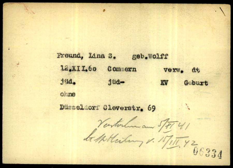 Zuletzt wohnte Lina Freund mit ihrer Tochter in der Klever Straße 29 in einer Wohnung in der ersten Etage. Das Haus gehörte der Familie des Bauunternehmers Dr. Adolf Breitenstein. Am 30. Oktober 1941 schrieb er an seine Familienangehörigen: „Die Sache mit Freunds will ich nur kurz andeuten. Alle Juden kommen von D. weg, z. Teil sind sie schon fort und zwar nach Polen. Sie werden mit 50 Kg. Handgepäck verfrachtet, sonst können sie nichts mitnehmen. Auf ihre Wohnung samt Inhalt müssen sie zu Gunsten des Staates verzichten. Für unsere Wohnung interessiert sich die Gestapo. Die alte Frau Freund bleibt hier – d. h sie kommt in ein jüdisches Altersheim, die Junge muss wandern. Das nötige drum und dran kannst Du Dir vorstellen. Wann die Auswanderung vor sich geht, weiß ich nicht; ein Teil ist jedenfalls schon fort. Das andere kann wohl jeden Tag passieren.“
