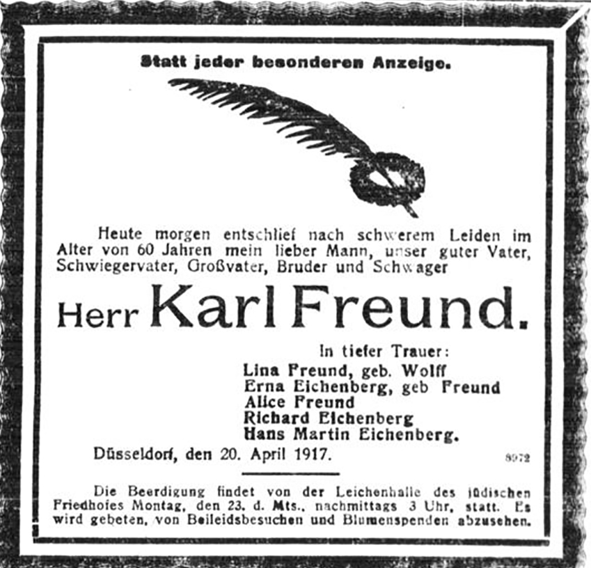 Am 20. April 1917 verstarb ihr Ehemann Karl Freund in Düsseldorf. Zu diesem Zeitpunkt wohnte Lina Freund in der Graf-Recke-Straße 33. In den 1930er Jahren wohnte Lina Freund mit ihrer ledigen Tochter Alice in der Kölner Straße 60 in Düsseldorf. Später zogen die beiden zur Klever Straße 31. Dort wohnte ihre Tochter Erna mit ihrer Familie. Am 24. November 1937 emigrierte ihr Enkelsohn Hans Martin Eichenberg nach Argentinien. Knapp ein Jahr später, am 3. Oktober 1938, meldeten sich ihre Tochter Erna und ihr Schwiegersohn Richard Eichenberg ebenfalls nach Buenos Aires ab. Die 78-jährige Lina Freund und ihre Tochter Alice blieben in Düsseldorf. Möglicherweise verschob ihre Tochter Alice ihre eigene Emigration aus Rücksicht auf ihre betagte Mutter.