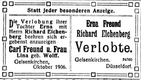 Am 12. April 1907 heiratete ihre Tochter Erna in Gelsenkirchen Richard Eichenberg. Das Paar zog nach der Hochzeit nach Düsseldorf in die Klever Straße 31. Auch Lina Freund zog mit ihrem Ehemann und der unverheirateten Tochter Alice nach Düsseldorf. Am 26. Januar 1908 kam in Düsseldorf Lina Freunds einziges Enkelkind Hans Martin Eichenberg zur Welt. Ihr Mann Karl Freund und ihre Tochter Erna erhielten 1914 Einzelprokura für die Firma von Richard Eichenberg in Düsseldorf. Die Firma war im Getreide Import tätig.