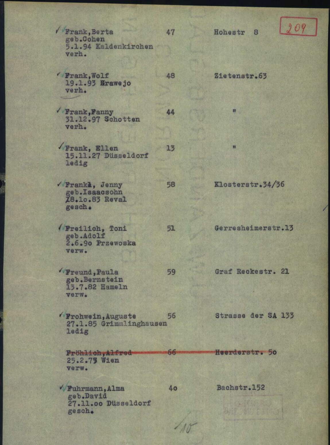 Bei Paula Freunds Zwangsumzug in das „Judenhaus“ Graf-Recke-Straße 21 am 29. Juli 1941 war ihr Mann Jakob bereits verstorben. Ihre Schwester Thekla war ebenfalls in das Haus Graf-Recke-Straße 21 gezogen. Am 10. November 1941 wurden Paula Freund und ihre Schwester Thekla Cohn in das Ghetto Minsk deportiert. Sie haben die NS-Zeit nicht überlebt.