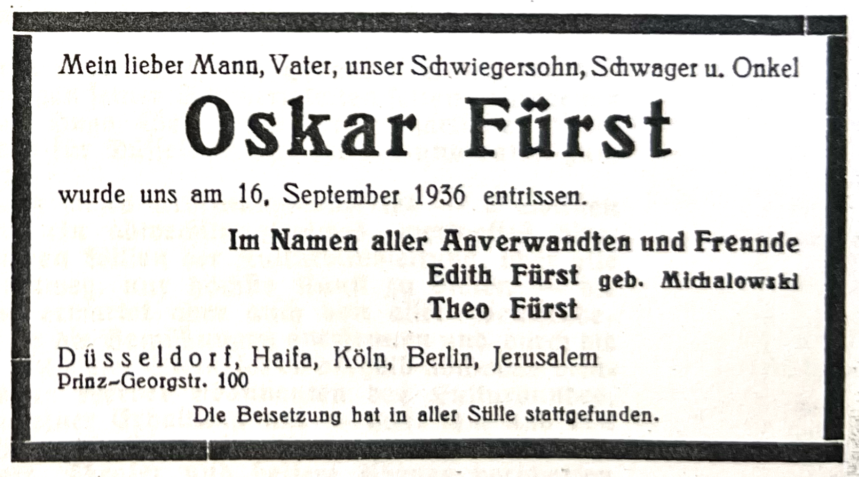 Durch die Machtübernahme der Nationalsozialisten 1933 wurde Oskar Fürst die Arbeit kontinuierlich schwieriger gemacht. Ihm setzte die Verfolgung und die damit einhergehenden Probleme so sehr zu, dass er am 16. September 1936 keinen Ausweg mehr sah und Selbstmord beging. Es folgte für Edith Fürst der nächste Schlag. Ihr Vater Isidor Michalowski starb am 10. März 1937 in Düsseldorf. Nun setzte Edith Fürst alles daran, Deutschland zu verlassen. Am liebsten würde sie zu ihrem Sohn Theodor, der seit 1934 in Palästina war. Doch die Emigrationsvorbereitungen zogen sich in die Länge. So erlitt Edith Fürst noch die Pogromnacht 1938 in Düsseldorf. Ihre sehr wertvoll eingerichtete Wohnung wurde stark demoliert. Zuletzt wohnte Edith Fürst in der Graf-Recke-Straße 16.