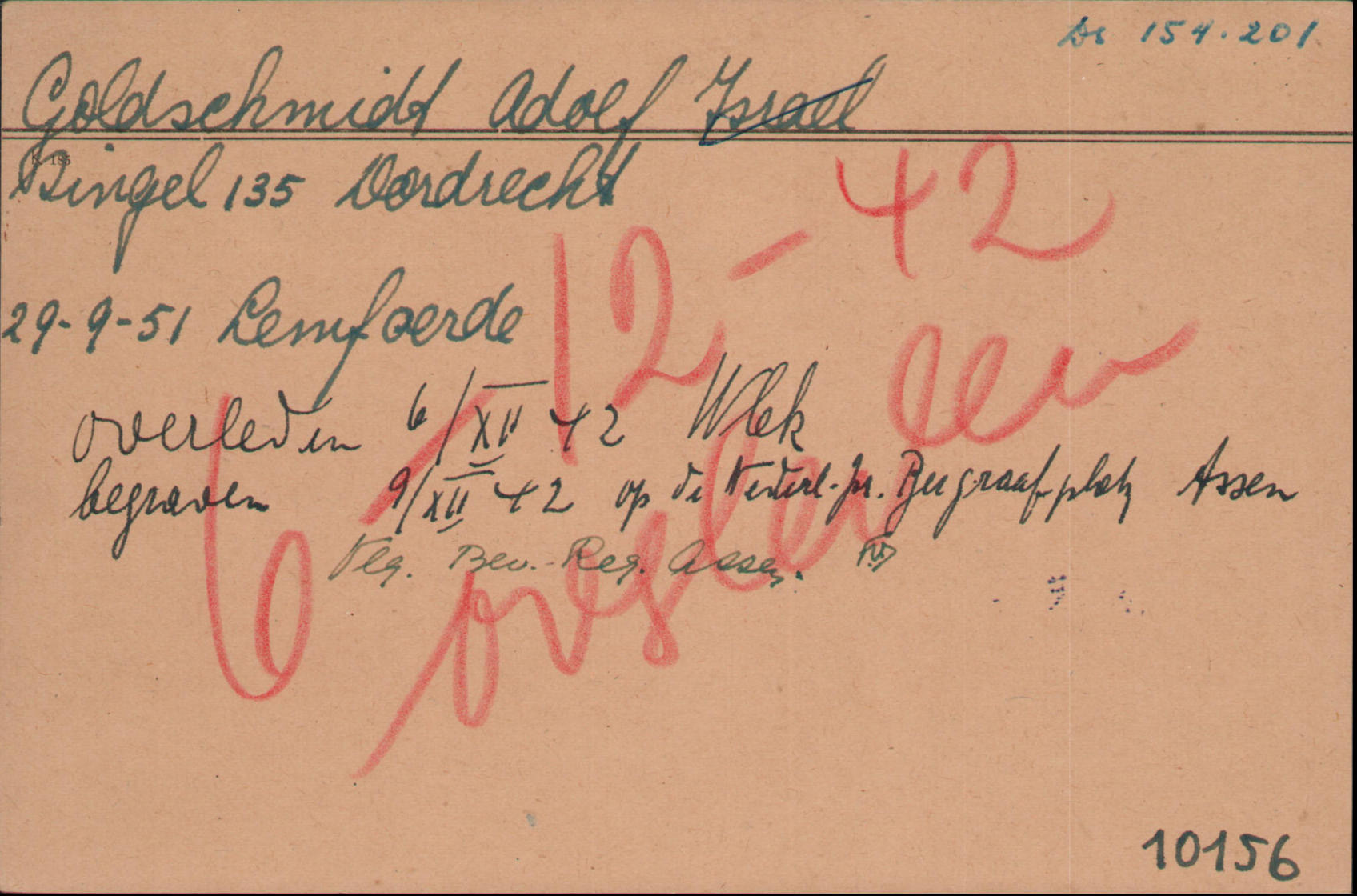 Am 10. November 1942 erfolgte eine große Razzia der deutschen Behörden gegen die jüdische Bevölkerung. In Dordrecht wurden 29 Juden auf der Straße und aus ihren Unterkünften heraus verhaftet. Im Haus Singel 229 hielten sich mehrere jüdische ältere Menschen versteckt. Unter ihnen war auch der 91-jährige Adolf Goldschmidt. Er war erst am 1. September 1942 in das Haus gekommen. Nach der Verhaftung wurde er in das sogenannte Durchgangslager Westerbork gebracht. Dort verstarb er am 6. Dezember 1942. Seine Tochter Margarethe, die sich ebenfalls im Lager Westerbork befunden hatte, war kurz zuvor mit ihrer Familie in das Vernichtungslager Auschwitz deportiert worden. Adolf Goldschmidt wurde am 9. Dezember 1942 auf dem jüdischen Friedhof in Assen in den Niederlanden begraben. Auch sein Sohn Siegfried wurde mit seiner Frau aus den Niederlanden deportiert und im Vernichtungslager Auschwitz ermordet.