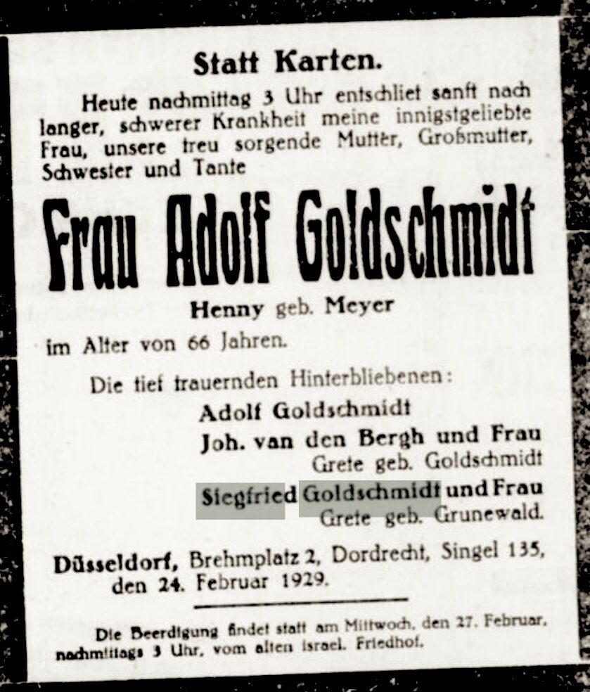 Im Jahr 1920 erlitten Adolf Goldschmidt und seine Frau Henriette einen großen Verlust. Ihre Tochter Erna starb am 10. Juli 1920 in Düsseldorf. Sie wurde nur 35 Jahre alt. Neun Jahre später, am 24. Februar 1929, verstarb auch seine Frau Henriette in Düsseldorf im Alter von 66 Jahren. Sie wurde auf dem alten jüdischen Friedhof begraben. Doch Adolf Goldschmidt verkraftete tapfer den Verlust. Er feierte am 29. September 1931 mit Familie und Bekannten seinen 80. Geburtstag in der Grunerstr. 30, wie das “Gemeindeblatt für den Synagogenbezirk Düsseldorf” in seiner Ausgabe vom 10. Oktober 1931 vermeldete.