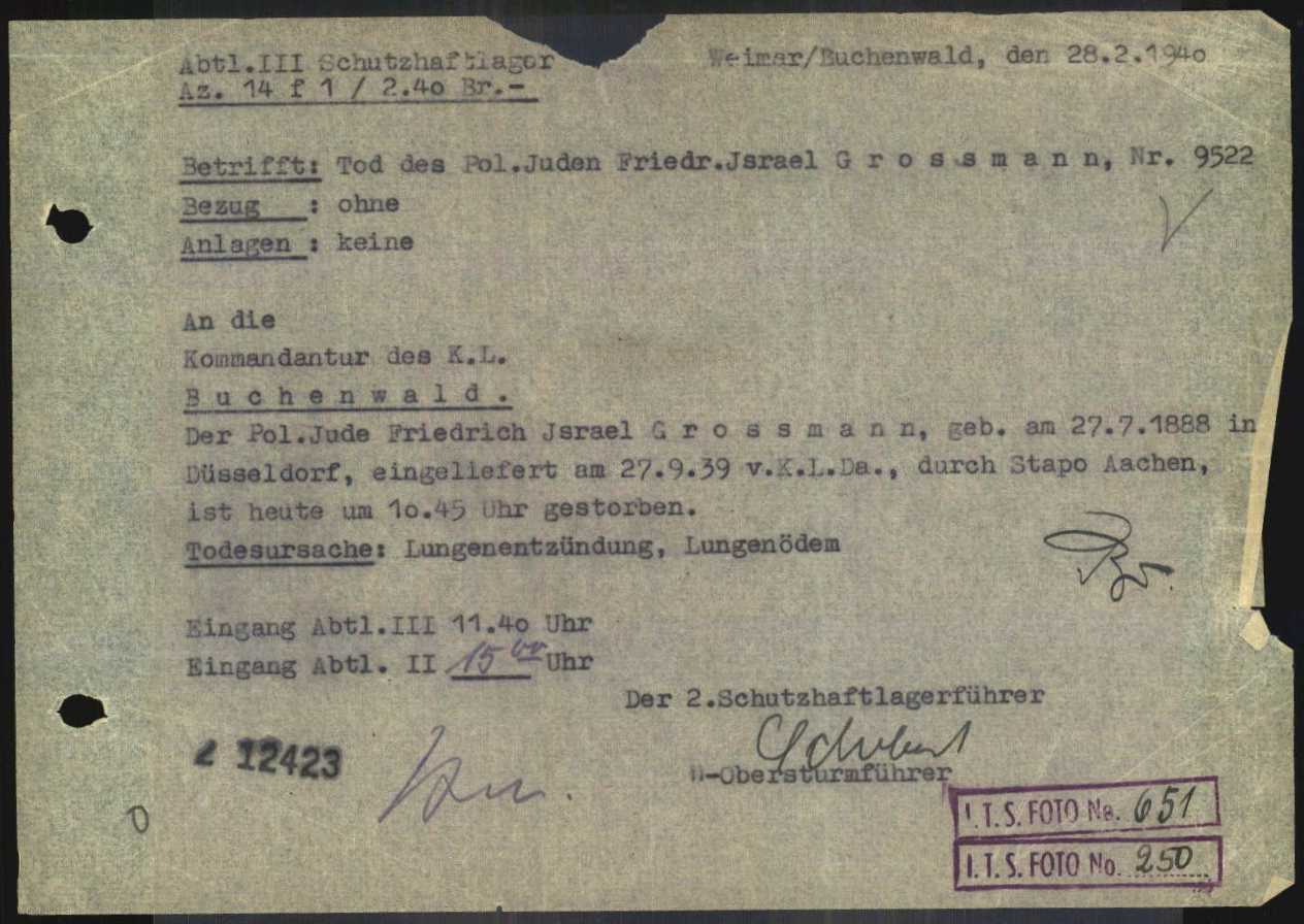 Fritz Grossmann wurde am 3. Juli 1939 beim versuchten Grenzübertritt nach Belgien von der Gestapo Aachen festgenommen und in das KZ Dachau gebracht. Von dort wurde er am 27. September 1939 ins KZ Buchenwald überführt. Dort wurde sein Tod am 28. Februar 1940 in den Sterbebüchern des Lagers vermerkt.