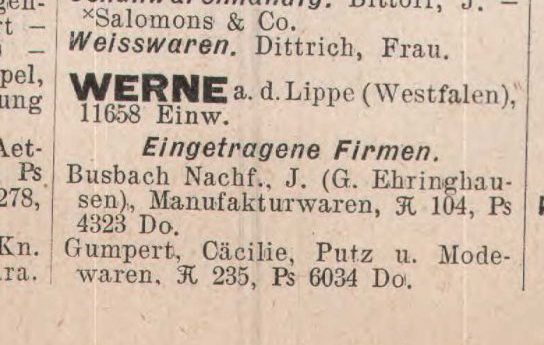 In der Nacht vom 9. auf den 10. November 1938 kam es auch in Werne zu Ausschreitungen. Einige Nationalsozialisten drangen zunächst in das Geschäft “Cäcilie Gumpert” ein und warfen die Waren auf die Straße. Dann setzten sie die Zerstörungen im gesamten Haus fort. Louis Gumpert flüchtete in das Dachgeschoß des Hauses. In Panik versuchte er, auf das Dach des Nachbarhauses zu flüchten. Der Versuch misslang und Louis Gumpert fiel aus etwa 8 Metern Höhe auf den Boden und verletzte sich dabei schwer. Im Krankenhaus hielt der behandelnde Assistenzarzt Dr. Starck am 10. November 1938 den medizinischen Befund fest: „4 .) Louis Gumpert, geb. 14.12.75 aus Werne. An frischen Verletzungen wurden festgestellt: Bluterguss an beiden Augen mit starkem Vorquellen der Bindehaut des rechten Auges, Gehirnerschütterung, Kniescheibenbruch rechts. Prellung des Rücken und des rechten Oberschenkels. G. bedarf stationärer Krankenhausbehandlung für mehrere Wochen“. Aus dem St. Christophorus Krankenhaus in Werne begab sich Louis Gumpert zusammen mit seinen Schwestern Cäcilie Gumpert und Helene Cahn, geborene Gumpert (1869 Werne – 1942 Treblinka) im Frühjahr 1939 nach Düsseldorf, wo seine Schwägerin Bertha Gumpert, geborene Tannenbaum, lebte. Sein Bruder Sally Gumpert war 1928 in Düsseldorf verstorben.