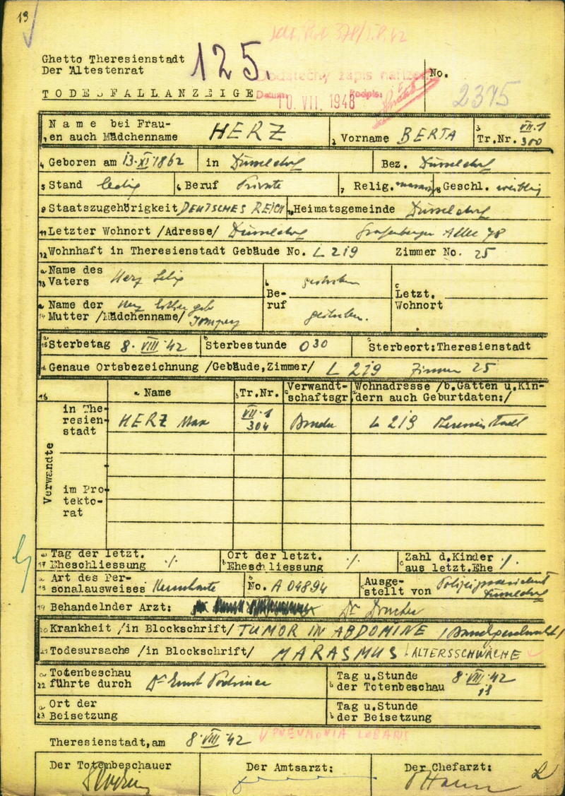 Bertha Herz starb am 8. August 1942 im Ghetto. Ihr Bruder Max Herz wurde am 21. September 1942 in das Vernichtungslager Treblinka gebracht und ermordet.