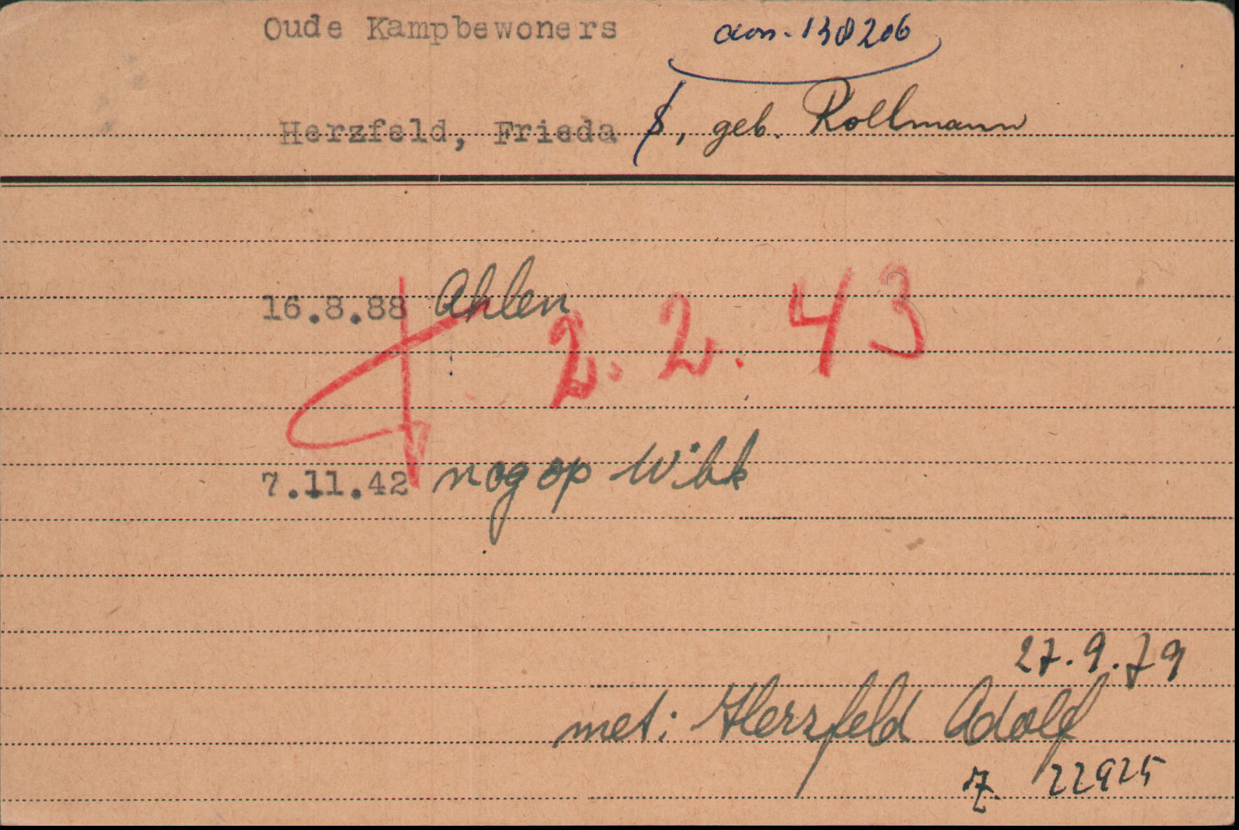 Das Ehepaar Herzfeld wurde vom 19. Januar 1942 bis zum 2. Februar 1943 im „Judendurchgangslager“ Westerbork interniert. Zuvor hatten sie nach Amsterdam ziehen müssen. Jeden Dienstag fuhr ein Güterzug aus dem Judendurchgangslager Westerbork „nach dem Osten“, in die Vernichtungslager Auschwitz-Birkenau und Sobibór. Die Fahrt dauerte ungefähr drei Tage. Am 2. Februar 1943 wurden auch Frieda und Adolf Herzfeld aus Westerbork in das Vernichtungslager Auschwitz-Birkenau deportiert und dort nach der Ankunft ermordet.