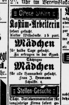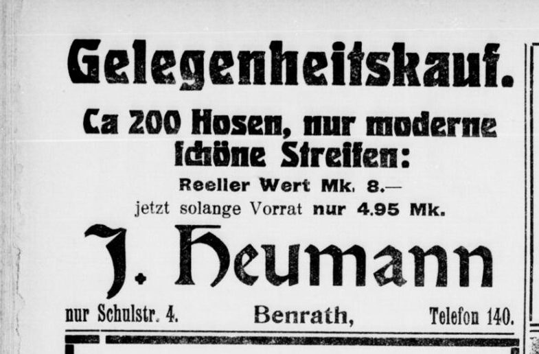 Am 20. Januar 1917 berichtete die Benrather Zeitung in ihrer Ausgabe: „Einbruchs-Diebstahl. In der vergangenen Nacht wurde in dem Manufakturwaren-Geschäft Heumann, Schulstraße eingebrochen. Es wurde ein größerer Posten Kleidungsstücke gestohlen. Die Täter haben sich an Ort und Stelle umgezogen. Die von den Tätern zurückgelassenen Sachen können auf Zimmer 26 des Polizeiamts – Rathaus, Erdgeschoß – besichtigt werden. Wer durch Wiedererkennung der von den Tätern zurückgelassenen Kleidungsstücke zur Ermittlung der Täter beiträgt, erhält wie wir hören, eine Belohnung von 20 Mark.“