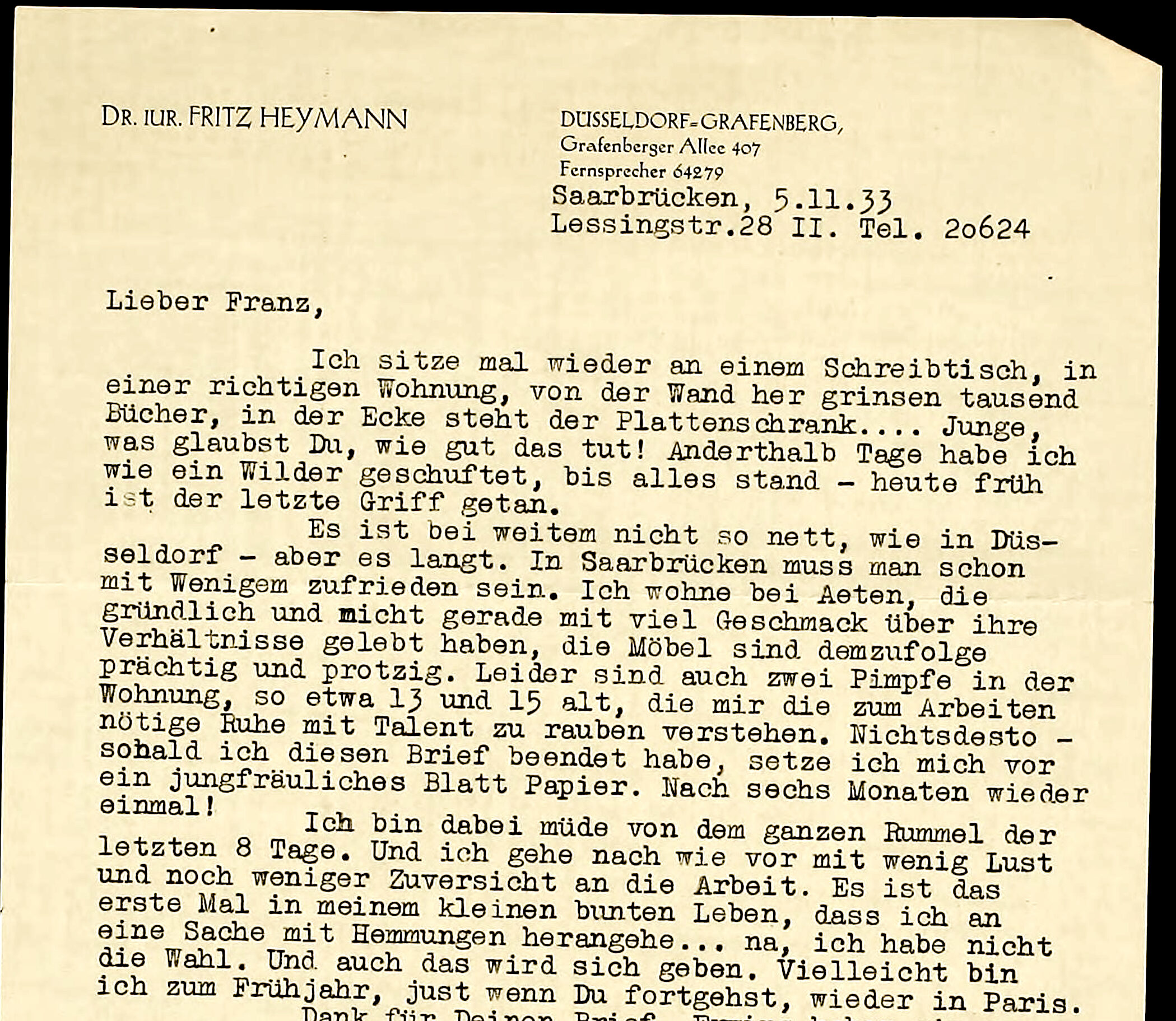 Im Jahre 1927 wurde Fritz Heymann nach vorübergehender Mitarbeit bei der Berliner Vossischen Zeitung Redakteur bei der Düsseldorfer Lokalzeitung. Ab 1928 verantwortlich für den Handelsteil, schrieb er auch feuilletonistische und politische Beiträge. Im April 1930 zeigte sich Fritz Heymann als zupackender Wegbegleiter der städtischen Finanzpolitik.