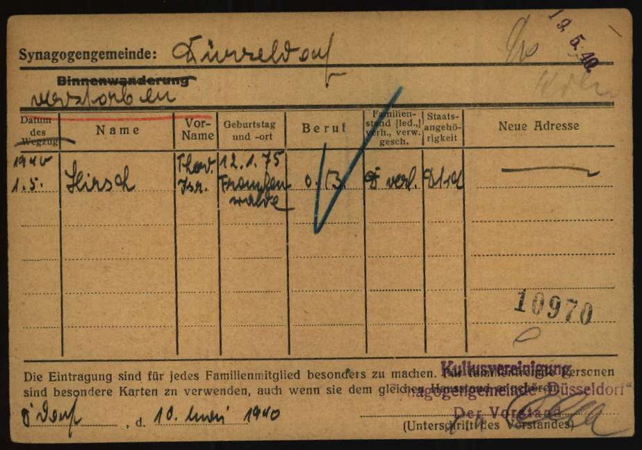Die Witwe Jenny Hirsch wurde am 27. Oktober 1941 mit ihrem Schwager Ignatz Hirsch und der Familie Oberländer von Düsseldorf in das Ghetto von Litzmannstadt/Łódź deportiert. Ihr Grundstück Grunerstraße 19 wurde am 25. Oktober 1941 beschlagnahmt und die Wohnung versiegelt. Die Möbel und der Hausrat wurden versteigert und das Grundstück am 13. Februar 1942 endgültig umgeschrieben. Zu ihrem beschlagnahmten Vermögen gehörten auch Wertpapiere der „Rheinischen Stahlwerke“ im Wert von 500 RM.